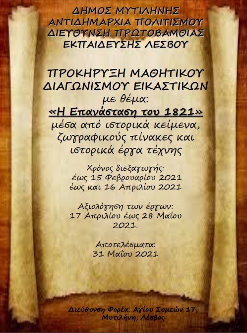 Ο Δήμος Μυτιλήνης διά της Αντιδημαρχίας Πολιτισμού σε συνεργασία με την Διεύθυνση Α/θμιας Εκπαίδευσης Νομού Λέσβου προκηρύσσει για τους μαθητές των σχολικών μονάδων, του Δήμου Μυτιλήνης Μαθητικό Διαγωνισμό με θέμα: «Η Επανάσταση του 1821»