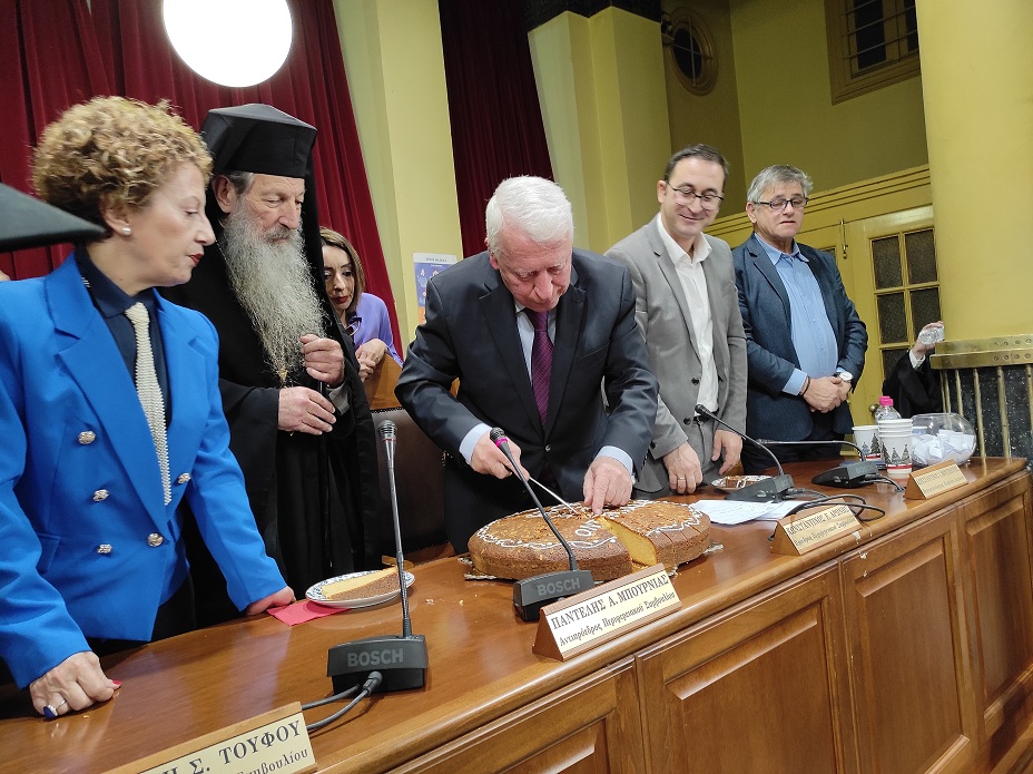 Αμέσως μετά ο Περιφερειάρχης με την ευχή για καλή χρονιά σε όλο τον κόσμο έκοψε τη βασιλόπιτα, της οποίας το φλουρί έπεσε στον Πρόεδρο του Δημοτικού Συμβουλίου Δήμου Μυτιλήνης Δημοσθένη Χατζηγιάννη.
