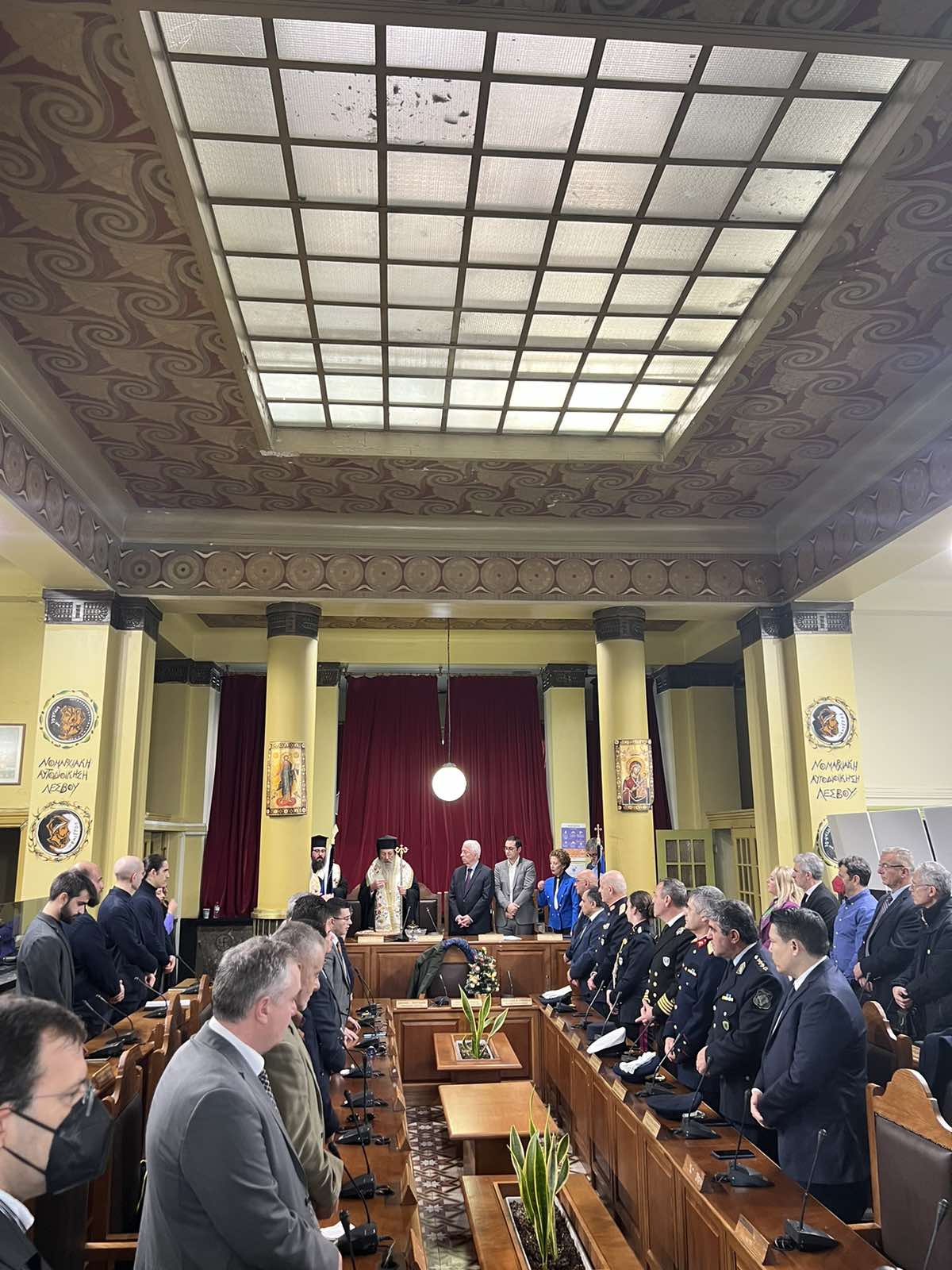 Το πρωί παρακολούθησε την πανηγυρική Θεία Λειτουργία των Θεοφανείων στον Ι.Ν Αγίου Αθανασίου- Μητροπόλεως Μυτιλήνης Χοροστατούντος του Σεβασμιότατου Μητροπολίτη Μυτιλήνης-Ερεσού και Πλωμαρίου κ.κ. Ιακώβου, την λιτανεία και την τελετή Αγιασμού των Υδάτων και ρίψης του Σταυρού στη θάλασσα.