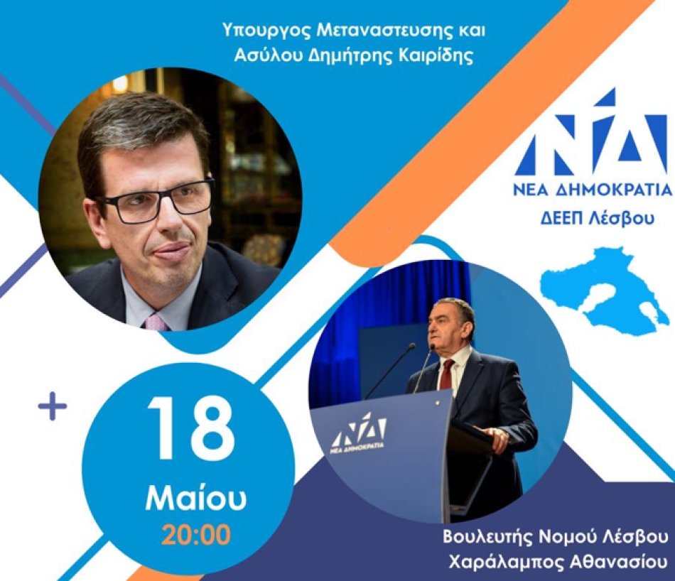 Το Σάββατο 18 Μάϊου και ώρα 20:00 στο καφέ «BLOCK», το οποίο βρίσκεται δίπλα στο mymarket, θα πραγματοποιηθεί ανοιχτή συζήτηση μελών και φίλων της ΝΔ, ενόψει της νέας κρίσιμης αναμέτρησης των Ευρωεκλογών, παρουσία του Υπουργού Μετανάστευσης και Ασύλου Δημήτρη Καιρίδη και του Βουλευτή του Νομού Λέσβου του κυβερνώντος κόμματος Χαράλαμπου Αθανασίου