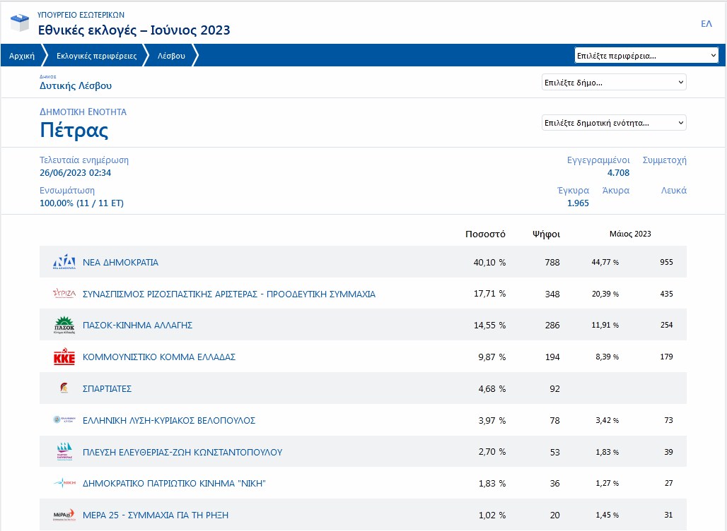 Στην Δημοτική Ενότητα Πέτρας η ΝΔ μείωσε την δυναμική της κατά 4,5 ποσοστιαίες μονάδες, καταγράφοντας απώλειες 167 ψήφων, παραμένοντας ωστόσο πρώτη και με διπλάσιο σχεδόν αριθμό ψήφων από τον ΣΥΡΙΖΑ- ΠΣ που ήρθε δεύτερος. Και ο ΣΥΡΙΖΑ – ΠΣ καταγράφει απώλειες 87 ψήφων και ποσοστού περίπου τριών ποσοστιαίων μονάδων. Στον αντίποδα το ΠΑΣΟΚ – ΚΙΝΑΛ ενίσχυσε την εκλογική του δύναμη με επιπλέον 32 ψήφους., όπως και το ΚΚΕ με 15 ψήφους.