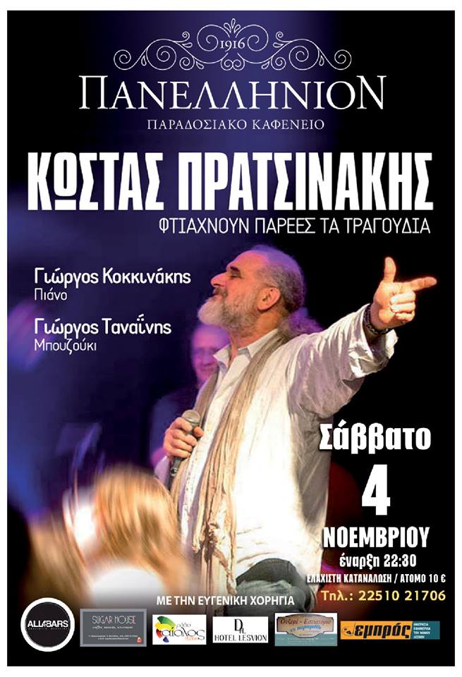 Θα κατέβει από τη Θεσσαλονίκη για να τραγουδήσει με το δικό του ξεχωριστό τρόπο τραγούδια από την προσωπική του δισκογραφία, με τον Γιώργο Καζαντζή, δικά του, αλλά και άλλων μεγάλων Ελλήνων δημιουργών. Ο Κώστας Πρατσινάκης έρχεται το Σάββατο 4 Νοεμβρίου για πρώτη φορά στη Μυτιλήνη και το «Πανελλήνιον».