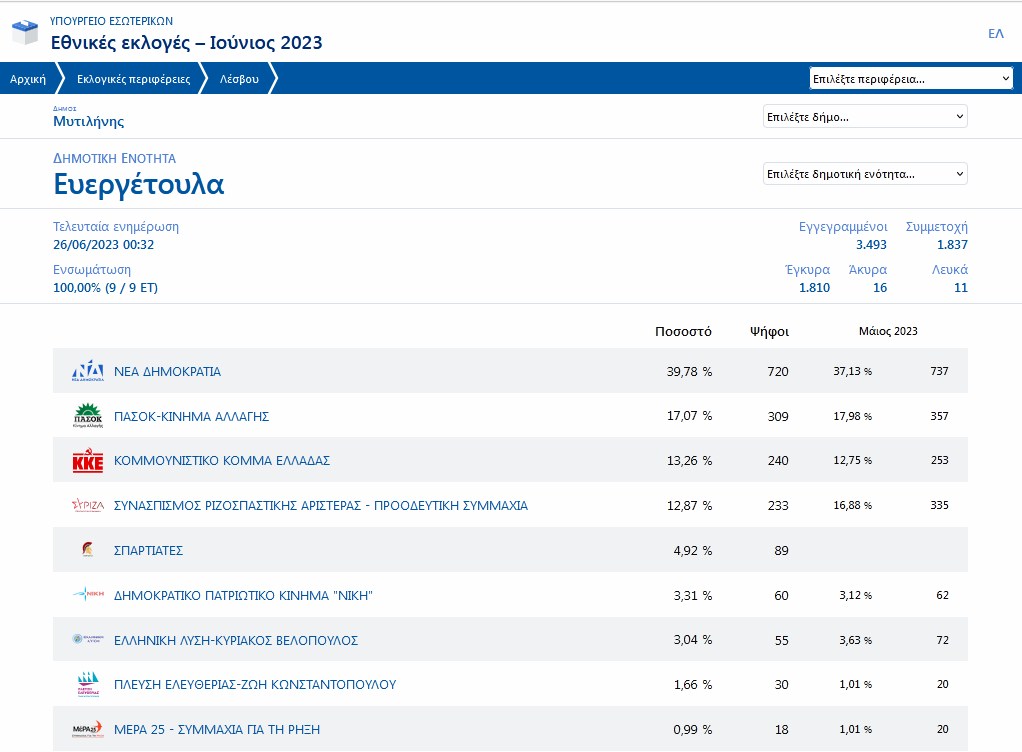 Στην Δημοτική Ενότητα Ευεργέτουλα, ΝΔ, ΠΑΣΟΚ – ΚΙΝΑΛ, ΚΚΕ και ΣΥΡΙΖΑ- ΠΣ καταγράφουν απώλειες ψήφων σε σχέση με τα αποτελέσματα του Μαΐου.