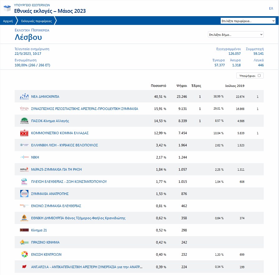 Στον ακόλουθο πίνακα φαίνονται τα αποτελέσματα των εκλογών του 2023 με ενσωμάτωση αποτελεσμάτων και στα 266 εκλογικά Τμήματα.