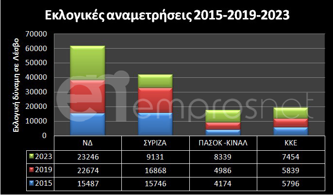 Αυτό που παρατηρείται στην εκλογική περιφέρεια της Λέσβου σε σχέση με τις προηγούμενες εκλογικές αναμετρήσεις είναι ότι το ΠΑΣΟΚ – ΚΙΝΑΛ έχει διπλασιάσει την εκλογική του βάση, το Κομμουνιστικό Κόμμα την αυξάνει σταθερά, ο ΣΥΡΙΖΑ – Προοδευτική Συμμαχία έχει μειώσει σημαντικά την δύναμή του, γεγονός που ενδεχομένως οφείλεται στην άνοδο του ΠΑΣΟΚ. Πρώτη είναι η Νέα Δημοκρατία που από το 2015 διατηρεί το προβάδισμα.