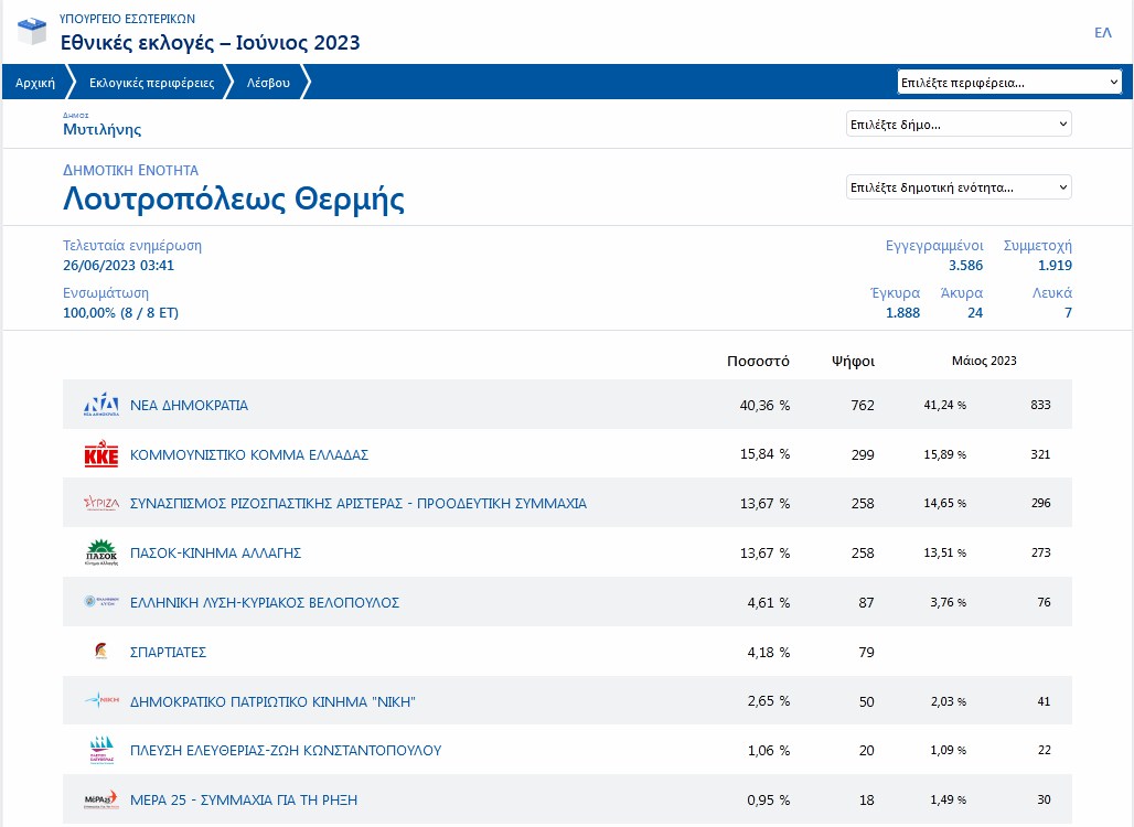 Με εξαίρεση το κόμμα του Κυριάκου Βελόπουλου, στην Δημοτική Ενότητα Λουτροπόλεως Θερμής τα υπόλοιπα τέσσερα πρώτα κόμματα, σημειώνουν απώλειες ψήφων. Μάλιστα στην ΔΕ Λουτροπόλεως Θερμής ΣΥΡΙΖΑ & ΠΑΣΟΚ μοιράζονται την τρίτη θέση που είχε κατακτήσει στις εκλογές του Μαΐου ο ΣΥΡΙΖΑ.