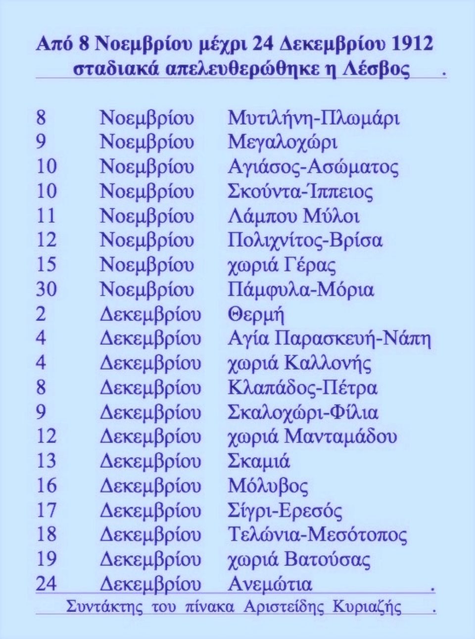 «Η κατάληψις των βορείων πόλεων. Την παρελθούσαν Κυριακήν (16-12-1912) το ατμόπλοιον “Αντζουλέττα” του Γιαννουλάτου παραλαβόν εντεύθεν ισχυράν δύναμιν πεζικού και πεζοναυτών και συνοδευόμενον υπό της θωρακοβάριδος "Ακτίου" έφθασε το απόγευμα της ιδίας ημέρας προ του Μολύβου. [...] Εκεί απεβίβασε δύο λόχους πεζικού και διμοιρίαν πεζοναυτών υπό τον λοχαγόν κ. Σαραντόπουλον. [...] μετέβη είτα και απεβίβασε περί τους 50 πεζοναύτας υπό τον ανθυπλοίαρχον κ. Εγγλέζον εις την καθαρώς κωμόπολιν Σίγριον [...] Απόσπασμα έτερον υπό υπαξιωματικόν διηυθύνθη προς την Ερεσσόν την οποίαν επίσης κατέλαβε». («Λαϊκός Αγών», 19-12-1912).