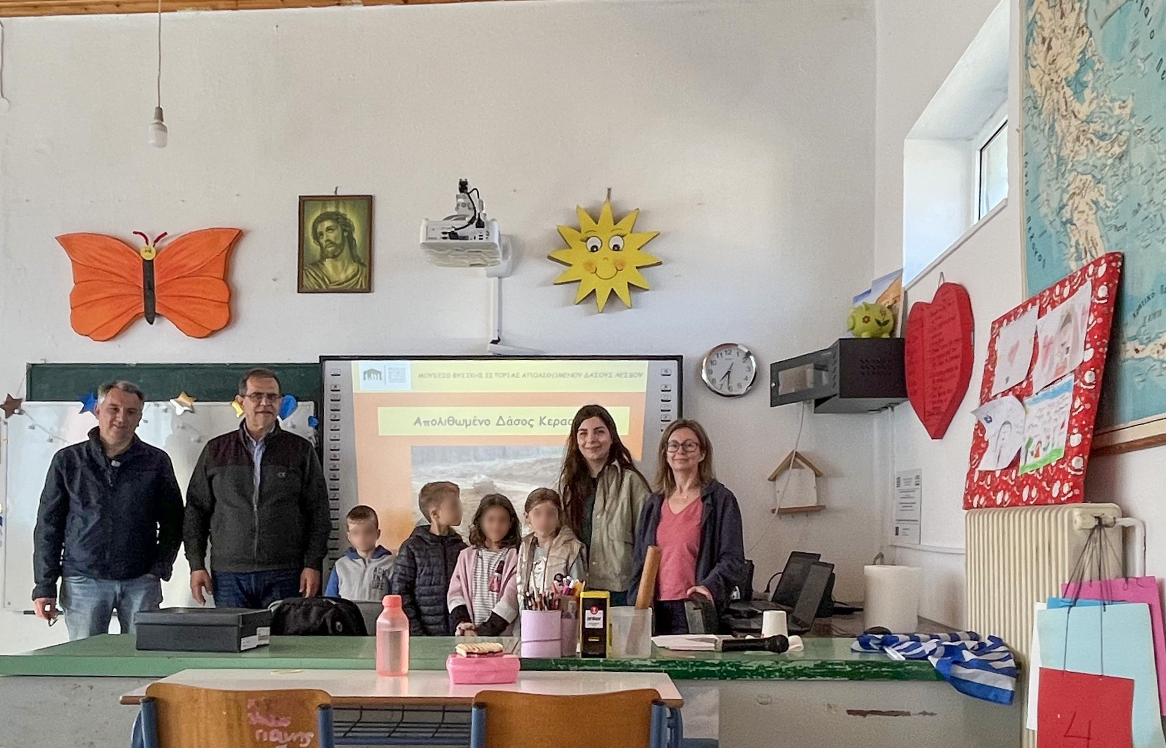 Το σχολείο επισκέφτηκαν ο Καθ. Νίκος Ζούρος, Διευθυντής του Μουσείου Φυσικής Ιστορίας Απολιθωμένου Δάσους Λέσβου, η κα. Κωνσταντίνα Μπεντάνα, Προϊσταμένη του Τμήματος Εκπαιδευτικών Προγραμμάτων του Μουσείου και ο κ. Ηλίας Βαλιάκος, Προϊστάμενος του Τμήματος Ερευνών του Μουσείου.