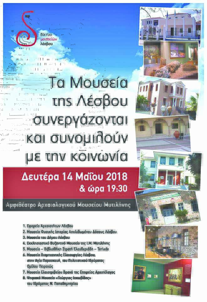 Εκδήλωση με θέμα «Τα Μουσεία της Λέσβου συνεργάζονται & συνομιλούν με την κοινωνία» θα οργανώσουν τη Δευτέρα 14 Μαΐου 2018 και ώρα 19:30 στο αμφιθέατρο του Αρχαιολογικού Μουσείου Μυτιλήνης οι εκπρόσωποι των φορέων που διαχειρίζονται τα σημαντικότερα Μουσεία της Λέσβου στα πλαίσια του εορτασμού της Διεθνούς Ημέρας Μουσείων 2018.