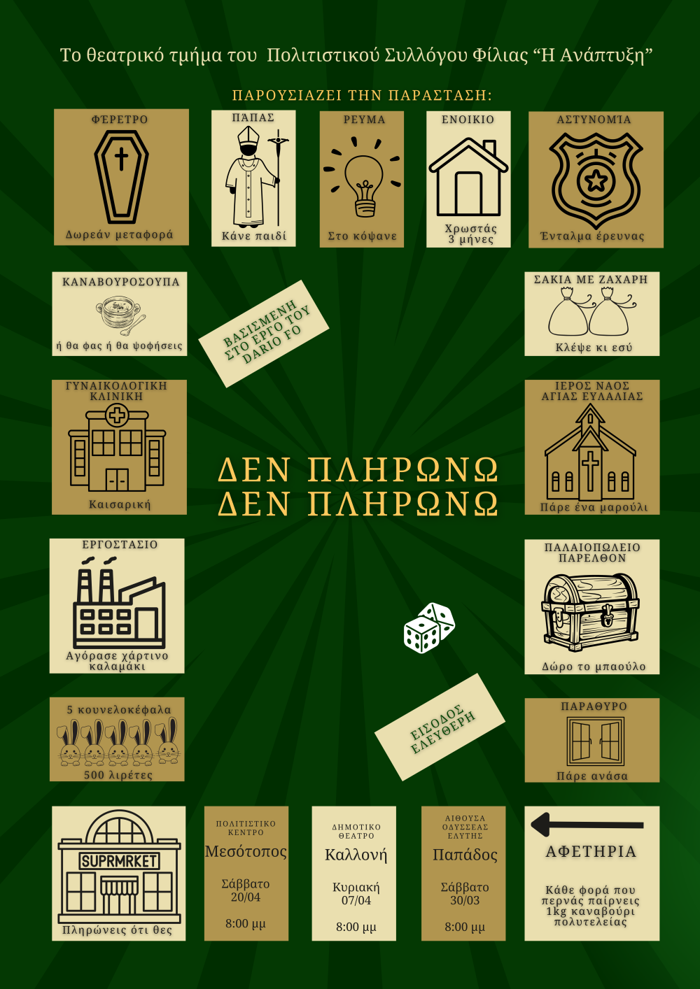 Το νεοσύστατο θεατρικό τμήμα του Πολιτιστικού Συλλόγου Φίλιας «Η Ανάπτυξη», παρουσιάζει την πρώτη του παράσταση με τίτλο «Δεν πληρώνω - Δεν πληρώνω», βασισμένη στο ομότιτλο έργο του Dario Fo.