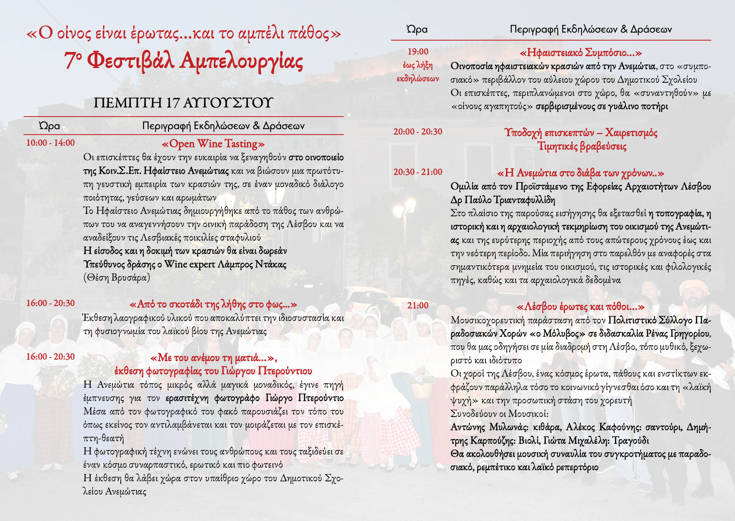 17:00-20:00 “Η Ένωση Φορέων Κ.ΑΛ.Ο. Βορείου Αιγαίου στο 7ο Φεστιβάλ Αμπελουργίας” Ι Η Ένωση «Συνέργεια» και τα μέλη της σας καλούν να γνωρίσετε από κοντά εγχειρήματα του Βορείου Αιγαίου που έχουν επιλέξει ένα κοινωνικό μοντέλο συνεργασίας και ανάπτυξης, ενώνοντας τις δυνάμεις τους. Η εκδήλωση είναι ανοιχτή στο κοινό, θα περιλαμβάνει παρουσίαση Φορέων και συζήτηση με εκπροσώπους τους. Η δράση θα ολοκληρωθεί με την ξενάγηση των συμμετεχόντων στο χωριό καταλήγοντας στο Οινοποιείο της Κοιν.Σ.Επ. Ηφαίστειο Ανεμώτιας, όπου θα πραγματοποιηθεί δωρεάν δοκιμή των κρασιών της. Την περιήγηση θα πραγματοποιήσουν ξεναγοί από την Κοιν.Σ.Επ. “Παρέα @ Λέσβος”