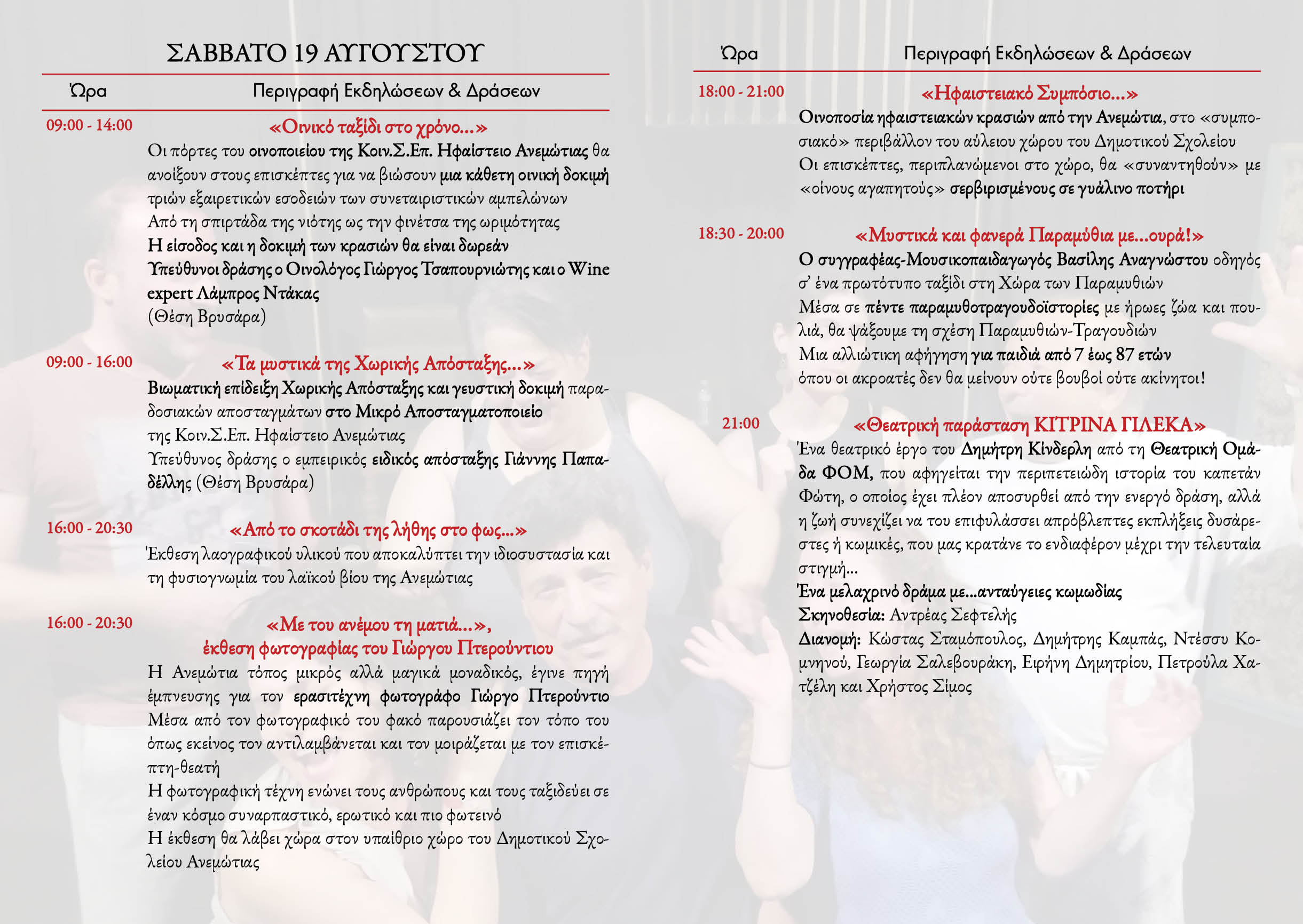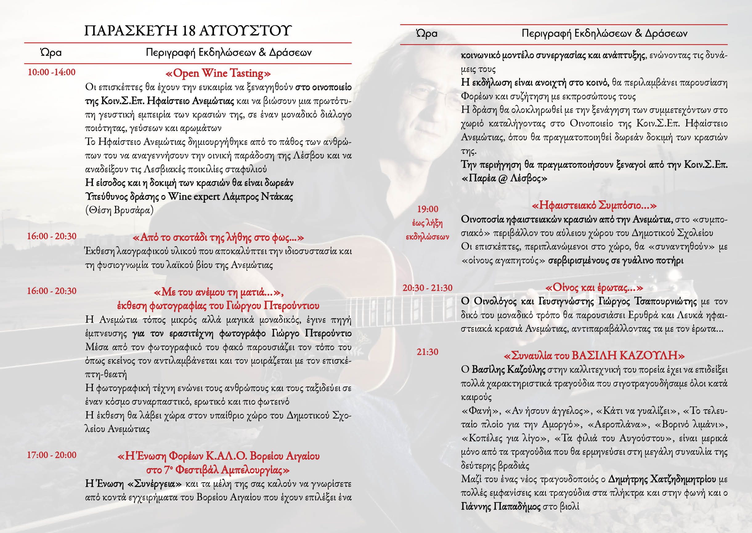 18:00-21:00 “Ηφαιστειακό Συμπόσιο…” Ι Οινοποσία ηφαιστειακών κρασιών από την Ανεμώτια, στο «συμποσιακό» περιβάλλον του αύλειου χώρου του Δημοτικού Σχολείου. Οι επισκέπτες, περιπλανώμενοι στο χώρο, θα «συναντηθούν» με «οίνους αγαπητούς» σερβιρισμένους σε γυάλινο ποτήρι.