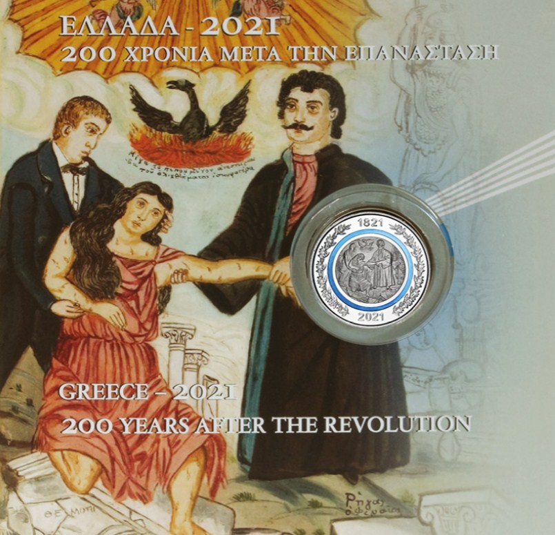 Είναι η πρώτη φορά που στην Ελλάδα κατασκευάζεται συλλεκτικό μετάλλιο με την συγκεκριμένη τεχνική. Πρόκειται για κέρμα αποτελούμενο από 3 μέρη τα οποία συνδέονται με πολυμερικό δακτύλιο σε μπλε χρώμα.Στην μία όψη απεικονίζεται ο πίνακας του Θεόφιλου. Η χαρακτική δεινότητα των καλλιτεχνών του Ελληνικού Νομισματοκοπείου, αποδεικνύεται για μια ακόμα φορά: κατάφερε να μεταφέρει σε τόσο μικρή διάμετρο εξαιρετικές λεπτομέρειες από το πρωτότυπο έργο, συλλαμβάνοντας ακόμα και τις εκφράσεις των προσώπων και τη στάση των σωμάτων.