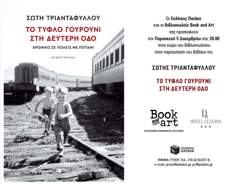 Την Παρασκευή 5 Δεκεμβρίου, στις 20:00, στο βιβλιοπωλείο BOOK & ART η συγγραφέας Σώτη Τριανταφύλλου θα παρουσιάσει το τελευταίο της βιβλίο με τίτλο «Το τυφλό γουρούνι στη δεύτερη οδό» από τις εκδόσεις ΠΑΤΑΚΗ.
