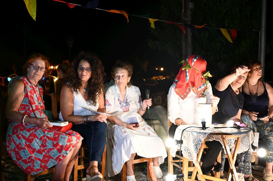 Ακολούθησαν τολμηρές και “αδιάντροπες” φράσεις, με καθαρτικό και μαγικό περιεχόμενο, σατιρικά σκετς, κέρασμα κρασιού και η βραδιά ολοκληρώθηκε με παραδοσιακή νησιώτικη μουσική και χορευτικές φιγούρες από τα χορευτικά σύνολα του Δήμου Λέσβου, του Συλλόγου “Η Επάνω Σκάλα” και του Συλλόγου “Αρίων”, υπό την καθοδήγηση του χοροδιδάσκαλου Κώστα Αγκοπιάν.