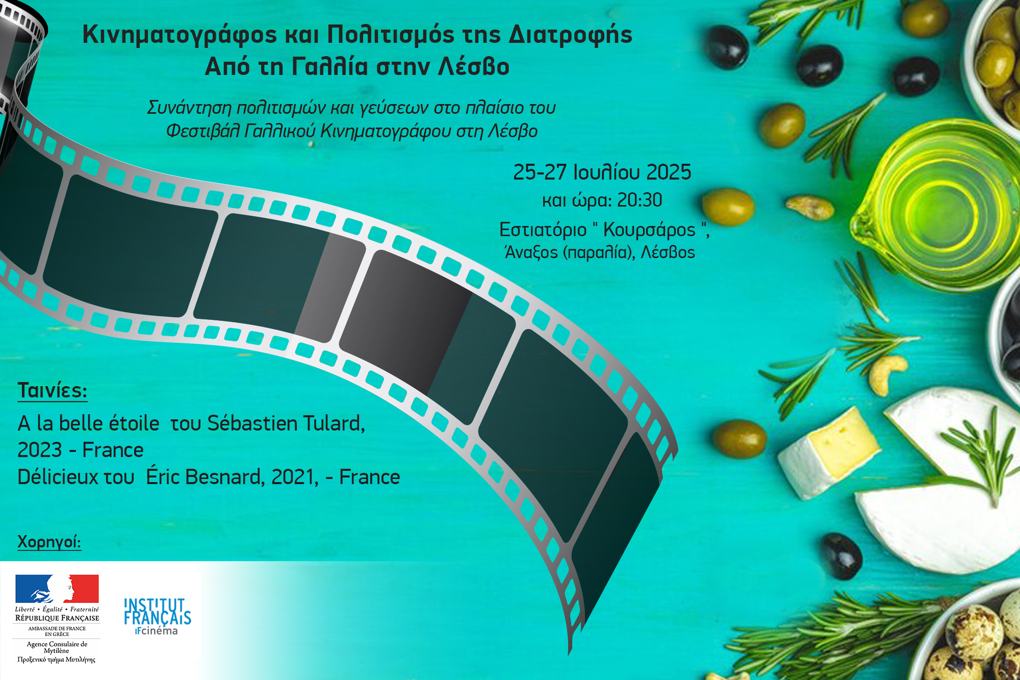 Η Λέσβος, με τη γαστρονομία της, τα βότανα, το ελαιόλαδο και τον πολιτισμό της, συναντά τη Γαλλία μέσα από τον κινηματογράφο, την γαστρονομία και τις κοινές αξίες της τοπικότητας, της βιωσιμότητας και της πολιτισμικής ανθεκτικότητας. Μια εκδήλωση που είναι ταυτόχρονα γιορτή, αφήγηση και πρόσκληση να δούμε τη διατροφή όχι μόνο ως ανάγκη ή απόλαυση, αλλά ως πράξη πολιτισμού.