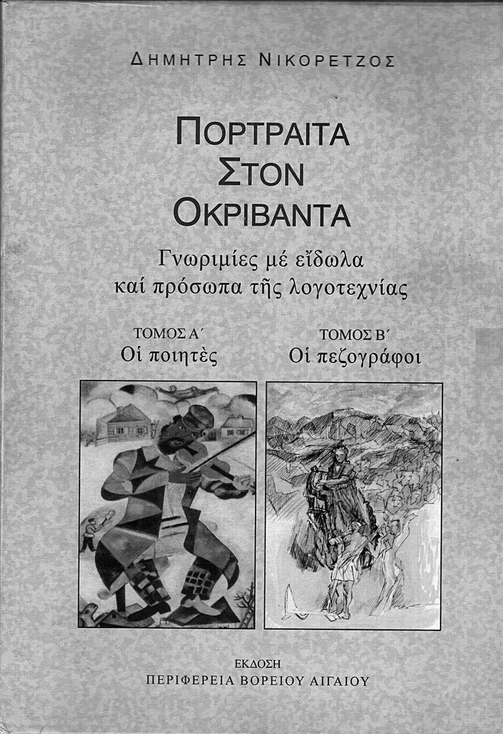 Δημήτρης Νικορέτζος: Πορτραίτα στον οκριβάντα. Γνωριμίες με είδωλα και πρόσωπα της λογοτεχνίας, Τόμος Α΄: Οι ποιητές, Τόμος Β’ : Οι πεζογράφοι, Έκδοση Περιφέρειας Βορείου Αιγαίου, Μυτιλήνη 2021, σελ. 587 + 545
