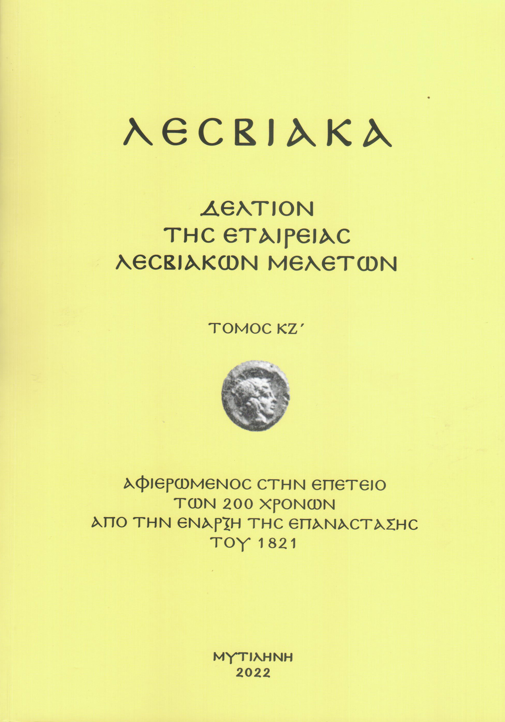 Αφιερωμένος στην επέτειο των 200 χρόνων από την έναρξη της Επανάστασης του 1821 είναι ο νέος τόμος της Εταιρείας Λεσβιακών Μελετών. Ο τόμος περιλαμβάνει πέντε σπουδαίες μελέτες και συνοδεύεται με ένα πολύ χρήσιμο cd με δώδεκα παλαιότερες μελέτες για το «Λεσβιακό Εικοσιένα» δημοσιευμένες στα «Λεσβιακά» παρελθόντων ετών. Οι πέντε μελέτες του παρόντος τόμου είναι: : Στρατής Αναγνώστου: «Η Λέσβος κατά τη διάρκεια της Ελληνικής Επανάστασης του 1821» (σελ 13 - 186), Στρατής Χαραλάμπους: «Η κληρονομιά του Kulakszizade Μουσταφά Αγά» (σελ. 187 - 248), Δημήτρης Μπούμπας: «Λεσβιακές Οικογένειες με προσφορά στο δημόσιο βίο της χώρας. Η Επανάσταση του 1821 και η περάτωση της Οικογένειας Νιάνια» (σελ. 249 - 264), Μαίρη Τσιτιμάκη: « Η χορηγική δραστηριότητα για τη ναοδομία στην Λέσβο τις παραμονές της εθνεγερσίας» (σελ. 265 - 286), Μαρία Γ. Μόσχου « Ο Θεόφιλος Χατζημιχαήλ ως “διεθνής ζωγραφική ιδιοφυία” και ο εθνοκεντρικός λόγος της “γενιάς του ‘30” (σελ. 287 - 323).