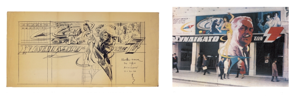 Παρουσιάζονται γιγαντοαφίσες τρία μέτρα επί ένα, σπαράγματα γιγαντοαφισών δυο μέτρα επί ένα, τη Βουγιουκλάκη, τον Κωνσταντάρα, τον Ρότζερ Μουρ, τον Κλιντ Ίστγουντ, μακέτες για γιγαντοαφίσες ταινιών, λιθόγραφα εκ των οποίων πολλά δεν έχει ούτε η Ταινιοθήκη της Ελλάδος, Εκτίθεται, επίσης, όλο το μπλοκ των σημειώσεών του που από μόνο του αποτελεί ένα σπάνιο τεκμήριο.