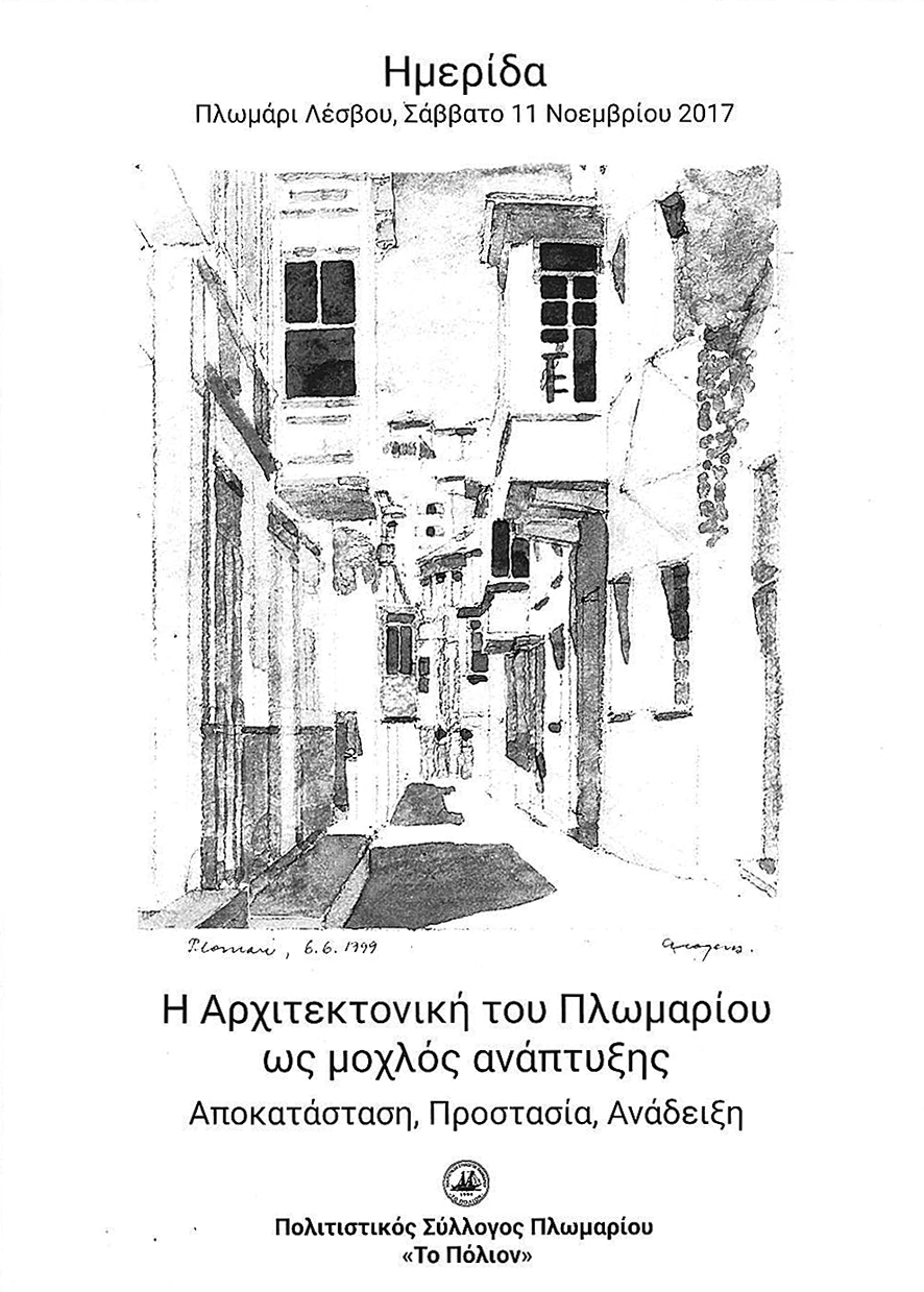 Τα παραπάνω είναι από τον πρόλογο του Δ.Σ Πολιτιστικού Συλλόγου Πλωμαρίου «Το Πόλιον», ενός Συλλόγου με μεγάλη προσφορά στο χωριό. Στον τόμο βρίσκουμε τις εξής εισηγήσεις: Στρατής Φραντζέσκος, Αρχιτέκτων, Πρόεδρος του Συλλόγου Αρχιτεκτόνων Λέσβου: Η αρχιτεκτονική φυσιογνωμία του Πλωμαρίου. Δυνατότητες και προοπτικές για ένα νέο και βιώσιμο μοντέλο ανάπτυξης, Παναγιώτης Θεοδωρίδης, Αρχιτέκτων Μηχανικός, Παραδοσιακή Αρχιτεκτονική: Προβλήματα προστασίας, ένταξης και συνέχειας, Ελένη Μαϊστρου, Ομότιμη Καθηγήτρια, Αρχιτεκτονικής Σχολής ΕΜΠ: Η σημασία της Αρχιτεκτονικής Κληρονομιάς στη συγκρότηση της ταυτότητας του τόπου. Η μεθοδολογία της προστασίας, Έλλη Βιτζηλαίου, Καθηγήτρια, Σχολής Πολιτικών Μηχανικών ΕΜΠ: Προστασία ιστορικών δομικών συστημάτων, Mogens Staerk, Associate Professor Emeritus, Aarhus School of Architecture, Denmark:The Beauty of Plomari.