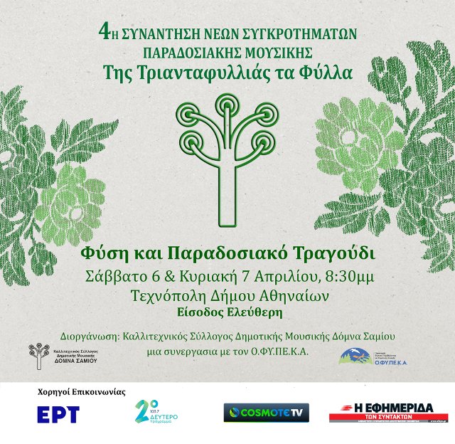 Ο Καλλιτεχνικός Σύλλογος Δημοτικής Μουσικής Δόμνα Σαμίου, σε συνεργασία με τον Οργανισμό Φυσικού Περιβάλλοντος και Κλιματικής Αλλαγής, παρουσιάζουν ένα διήμερο γεμάτο τραγούδια και μουσικές με είκοσι μουσικά σχήματα από όλη την Ελλάδα και την Κύπρο, στις 6 & 7 Απριλίου 2024, στην Τεχνόπολη Δήμου Αθηναίων, με ελεύθερη είσοδο.