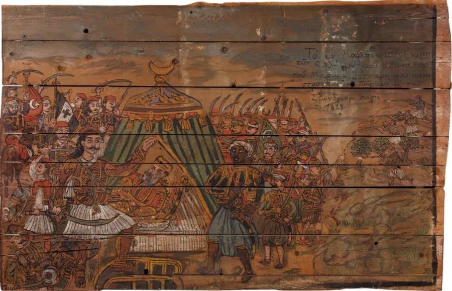 Ο Μάρκος Μπότσαρης αποτελεί αγαπημένο θέμα στην εικονογραφία του Θεόφιλου. Τη νύχτα της 21ης Αυγούστου του 1823, ο οπλαρχηγός με μια χούφτα Σουλιώτες αιφνιδίασε τους Οθωμανούς. Οι Τούρκοι υπέστησαν βαριές απώλειες, αλλά η μοίρα είχε άλλα σχέδια. Ο Μπότσαρης πυροβολήθηκε και πέθανε ακαριαία τη στιγμή της νίκης. Οι Σουλιώτες υποχώρησαν αμέσως γλιτώνοντας τη σορό του και οι Τούρκοι σώθηκαν από ολοσχερή καταστροφή. Μέσα από τα σανίδια, ο ζωγράφος ανασταίνει την εποχή των αγωνιστών σαν μια θρησκευτική λιτανεία του έθνους. Το έργο «Η νίκη των Ελλήνων στο Καρπενήσι και ο θάνατος του Μάρκου Μπότσαρη» έχει αρχική τιμή 120.000 ευρώ».