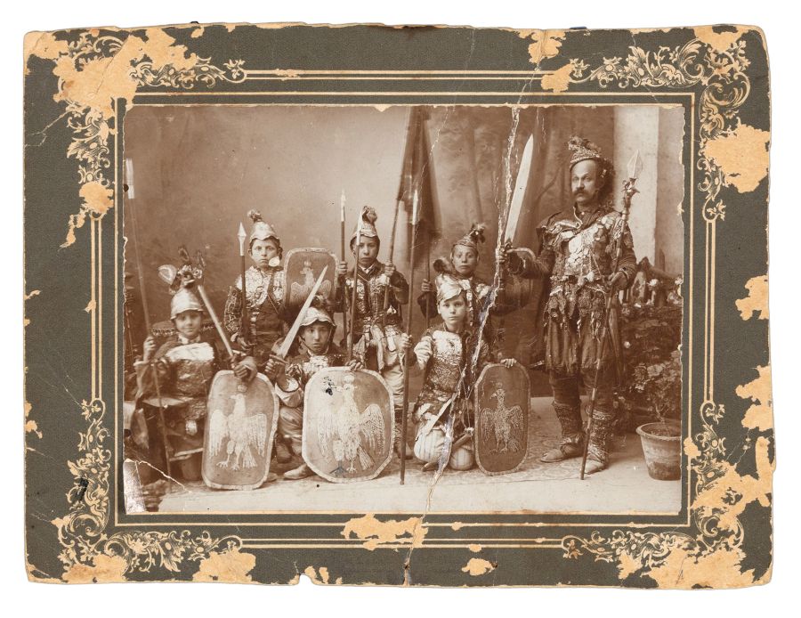 Τύπωμα αργύρου επικολλημένο σε πασπαρτού, 118 x 162 mm. (φθορές). Σημειώσεις με μολύβι στην πίσω όψη του πασπαρτού: «Θεόφιλος / λίγο μετά το 1926 / στη Μυτιλήνη», και από κάτω: «Δέν εἶναι Μυτιλήνη, ἀλλά Βόλος / (Στή μέση εἰκονίζεται ὁ κ. Μαχαιρίτσας / ἀπό τό Βόλο». [μαζί:] Ὁ Θεόφιλος μέ τή μητέρα του. Τύπωμα αργύρου επικολλημένο σε χαρτόνι (υπόλειμμα πασπαρτού), 160 x 120 mm. (κομμένη η κάτω δεξιά γωνία). (2), τιμή εκκίνησης 200 ευρώ