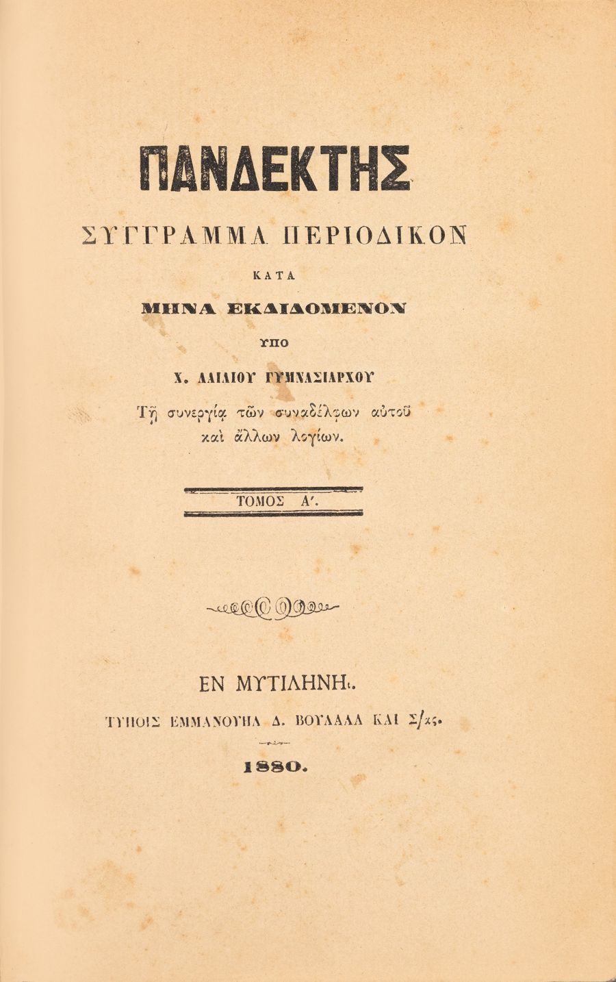 - Πανδέκτης, σύγγραμμα περιοδικόν κατά μῆνα ἐκδιδόμενον ὑπό Χ. Λαιλίου Γυμνασιάρχου, τῇ συνεργίᾳ τῶν συναδέλφων αὐτοῦ καί ἄλλων λογίων, τόμος Α, τα τεύχη Α´ -ΙΒ´ του Α´ έτους (30 Απριλίου 1879-30 Μαρτίου 1880), 8ο, 489 σ., Στοιχεία έκδοσης: Μυτιλήνη, Ε. Δ. Βουλαλάς & Σια, 1880.,
