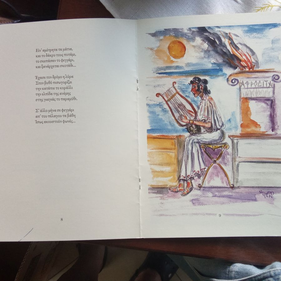 Το 2002, ζωγράφισα έξη «εικόνες», μια εικαστική απεικόνιση της πλοκής του μύθου, που προσπαθούν να μεταφέρουν στον αναγνώστη οι λέξεις. Τις θεωρώ μια άλλη πρόταση με την δύναμη των χρωμάτων, τα οποία μορφοποιούν το δράμα. Ενσωμάτωσα και ένα γράμμα της αείμνηστης φίλης μου, Αγγελικής Ιοννάτου, η οποία μελοποίησε και τραγούδησε την Σαπφώ στο Παρίσι, γιατί το είχε στα χέρια της και προσπάθησε να του βάλει νότες.
