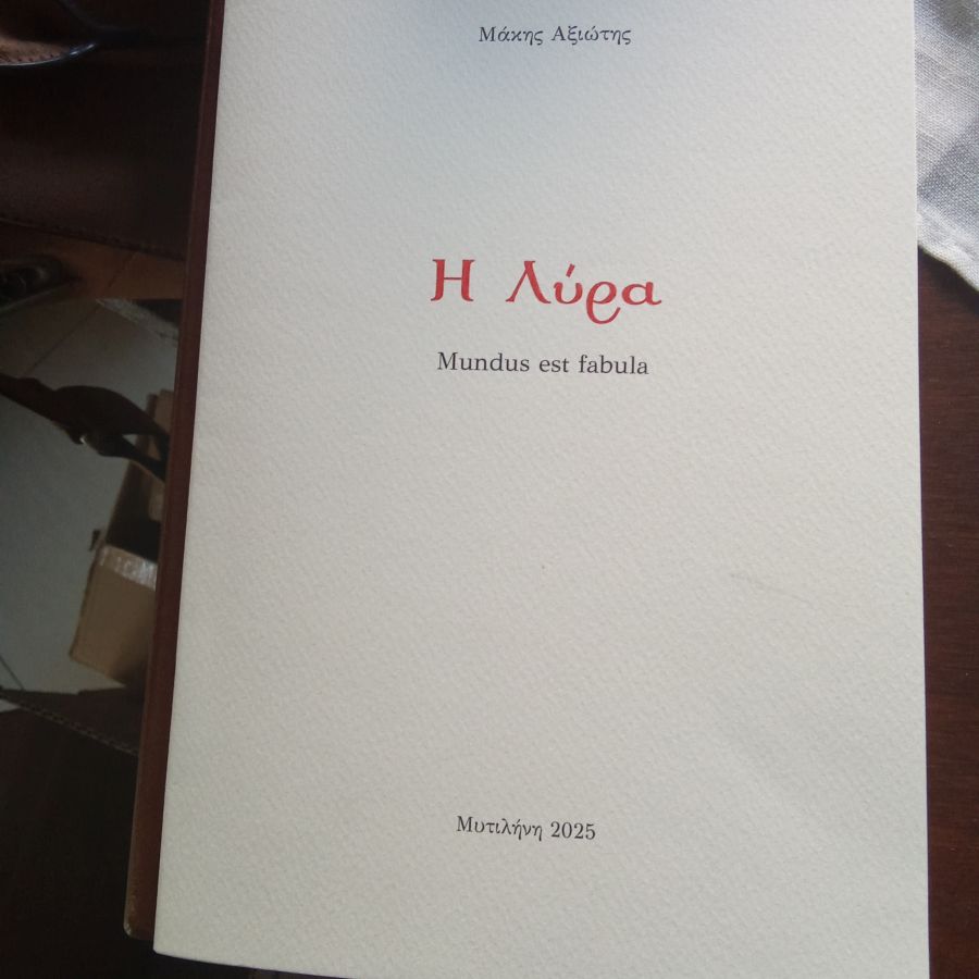 Μάκης Αξιώτης: Η λύρα. Mundusestfabula, (ποίημα), Μυτιλήνη 2025, σελ. 15