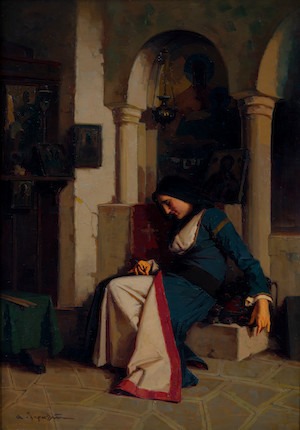 - Απόστολος Γεραλής: Στην προσευχή, υπογεγραμμένο στα ελληνικά (κάτω αριστερά), λάδι στο πάνελ 80 x 56,5 εκ, εκτίμηση €6,000 - €8,000