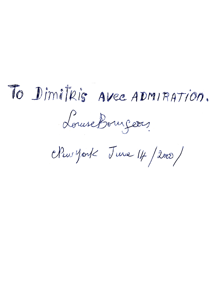 Για δέκα χρόνια, από το 2000 έως λίγες ημέρες πριν τον θάνατό της το 2010, ο Δημήτρης Γέρος, με δεσμούς με την Λέσβο, επισκεπτόταν τη Louise Bourgeois στο περίφημο σπίτι-στούντιο στη Νέα Υόρκη και στο οποίο τώρα στεγάζεται το Easton Foundation που είχε ιδρύσει πριν πεθάνει. Οι δυο καλλιτέχνες ανέπτυξαν μια γόνιμη φιλία από την οποία προέκυψε μια σειρά από μοναδικές φωτογραφίες με τίτλο «Casual Moments» στις οποίες παρουσιάζεται η μεγάλη Γάλλοαμερικανίδα γλύπτρια σε διάφορες φάσεις της καθημερινότητας της καθώς και απόψεις του χώρου όπου ζούσε και οι οποίες μας παραπέμπουν «στην αιώνια παρουσία της».