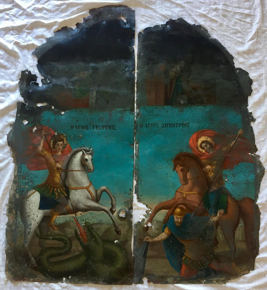 5) Στον δυτικό τοίχο μία διπλή εικόνα που απεικονίζει αριστερά τον Άγιο Γεώργιο και δεξιά τον Άγιο Δημήτριο, υπέρλαμπρους καβαλάρηδες, εξολοθρευτές του κακού, με διαστάσεις 120 x 107 εκατ.