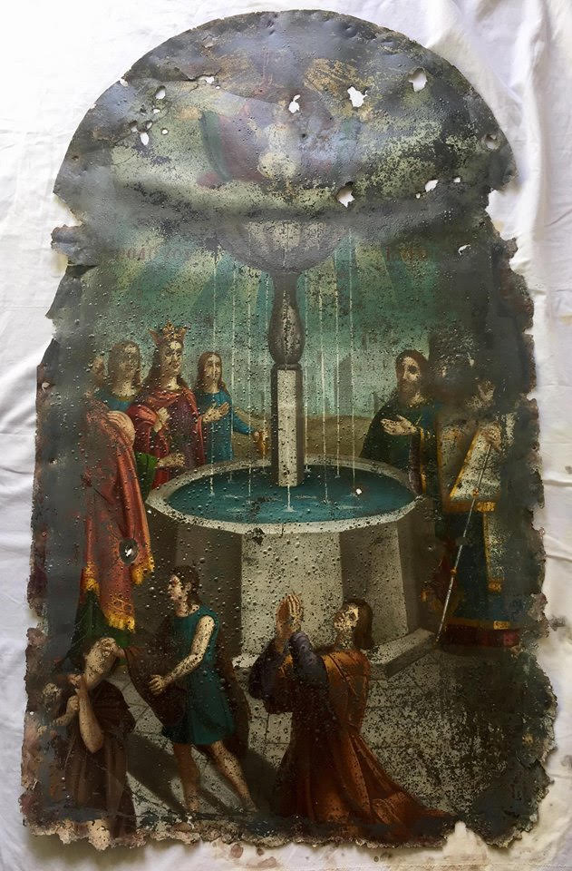 4) Δεξιά στον βόρειο πάλι τοίχο συναντάμε μια απεικόνιση κολυμβήθρας, με θεραπεία τυφλού και παραλυτικού, με διαστάσεις 126 x 74 εκατ. Η εικόνα αποτελεί παραλλαγή της ενεπίγραφης εικόνας του Παρεκκλησιού της Ζωοδόχου Πηγής Ασωμάτου, με διαστάσεις 87 x 61 εκατ., έργο του 1884 (βλέπε σελ. 323 του Λεσβιακού Ημερολογίου2022 του Παναγιώτη Σκορδά).