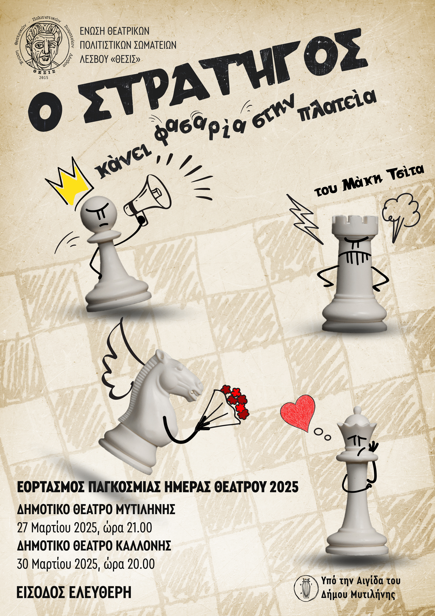 Η Ένωση Θεατρικών Πολιτιστικών Σωματείων Λέσβου "ΘΕΣΙΣ" , συνεχίζοντας την παράδοση του επί αρκετά χρόνια εορτασμού της παγκόσμιας ημέρας θεάτρου, παρουσιάζει την Πέμπτη στις 27 Μαρτίου 2025 στο Δημοτικό Θέατρο Μυτιλήνης στις 21.00 την θεατρική παράσταση με το έργο του Μάκη Τσίτα " Ο Στρατηγός κάνει φασαρία στην πλατεία" .