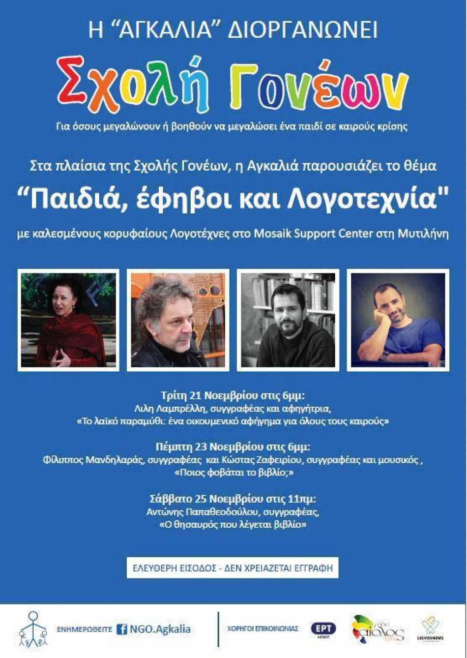 Οι γονείς από την πόλη της Μυτιλήνης δεν πρέπει να χάσουν το «Παιδιά, Έφηβοι και Λογοτεχνία» που γίνεται στο πλαίσιο της Σχολής Γονέων της «Αγκαλιάς»! Λιλή Λαμπρέλλη, Αντώνης Παπαθεοδούλου, Φίλιππος Μανδηλαράς, Κώστας Ζαφειρίου, πολυβραβευμένοι συγγραφείς, κορυφαίοι δημιουργοί έρχονται για τρεις μοναδικές διαλέξεις από την ερχόμενη εβδομάδα στο Κέντρο «Mosaik» στην οδό Σαπφούς.