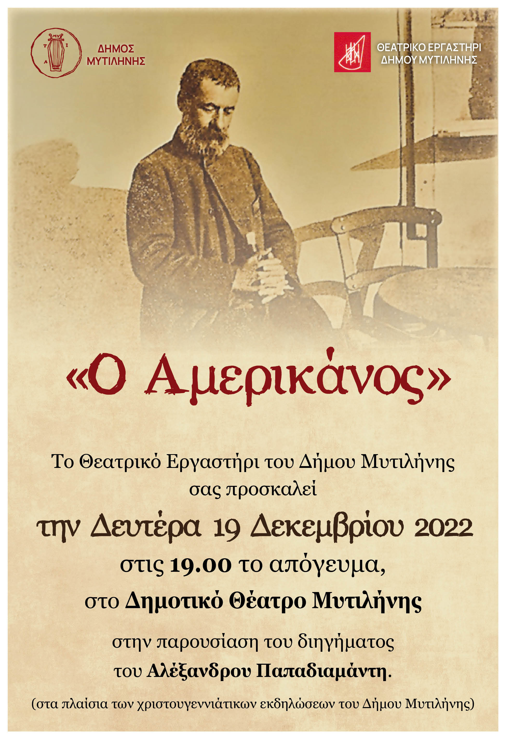 Το Θεατρικό Εργαστήρι του Δήμου Μυτιλήνης θα παρουσιάσει την Δευτέρα 19 Δεκεμβρίου στις 8:00 το βράδυ στο Δημοτικό Θέατρο Μυτιλήνης - στο πλαίσιο των χριστουγεννιάτικων εκδηλώσεων του Δήμου Μυτιλήνης - το διήγημα του Αλέξανδρου Παπαδιαμάντη «Ο Αμερικάνος».