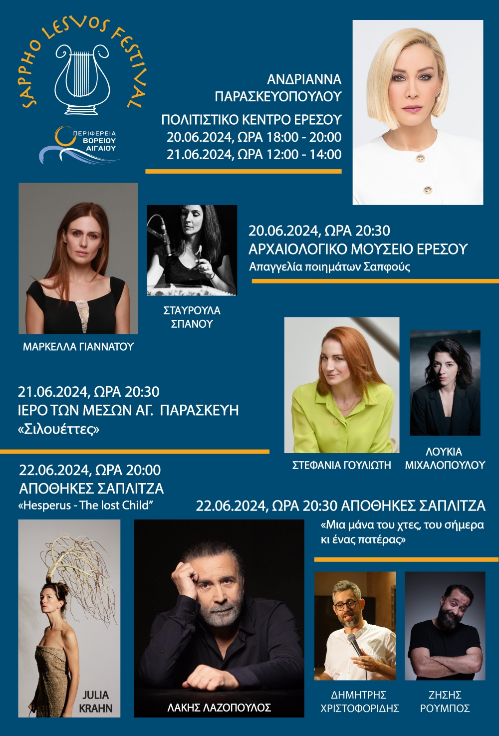 Αναλυτικότερα το πρόγραμμα περιλαμβάνει την Πέμπτη 20 Ιουνίου, 18:00 – 20:00, στο Πολιτιστικό Κέντρο Ερεσού εκδήλωση με θέμα «Αφιέρωμα στη ποιήτρια Σαπφώ» με ομιλητές τους Sandra Boehringer, καθηγήτρια Ελληνικής Ιστορίας στο Πανεπιστημίου του Στρασβούργου, με θεματική: «Ο ίλιγγος του Έρωτα. Η Σαπφώ και ο έρωτας μεταξύ γυναικών στην αρχαία Ελλάδα», Τασούλα Καραγεωργίου, συγγραφέας μεταφράστρια ποιημάτων Σαπφούς, με θεματική: «Η Σαπφώ και το νεοελληνικό δημοτικό τραγούδι» και Laurie Laufer, καθηγήτρια στις ψυχαναλυτικές σπουδές, Université Paris Cité) με θεματική: «Οι ηρωίδες του μοντερνισμού». Την εκδήλωση συντονίζει η δημοσιογράφος Ανδριάννα Παρασκευοπούλου.