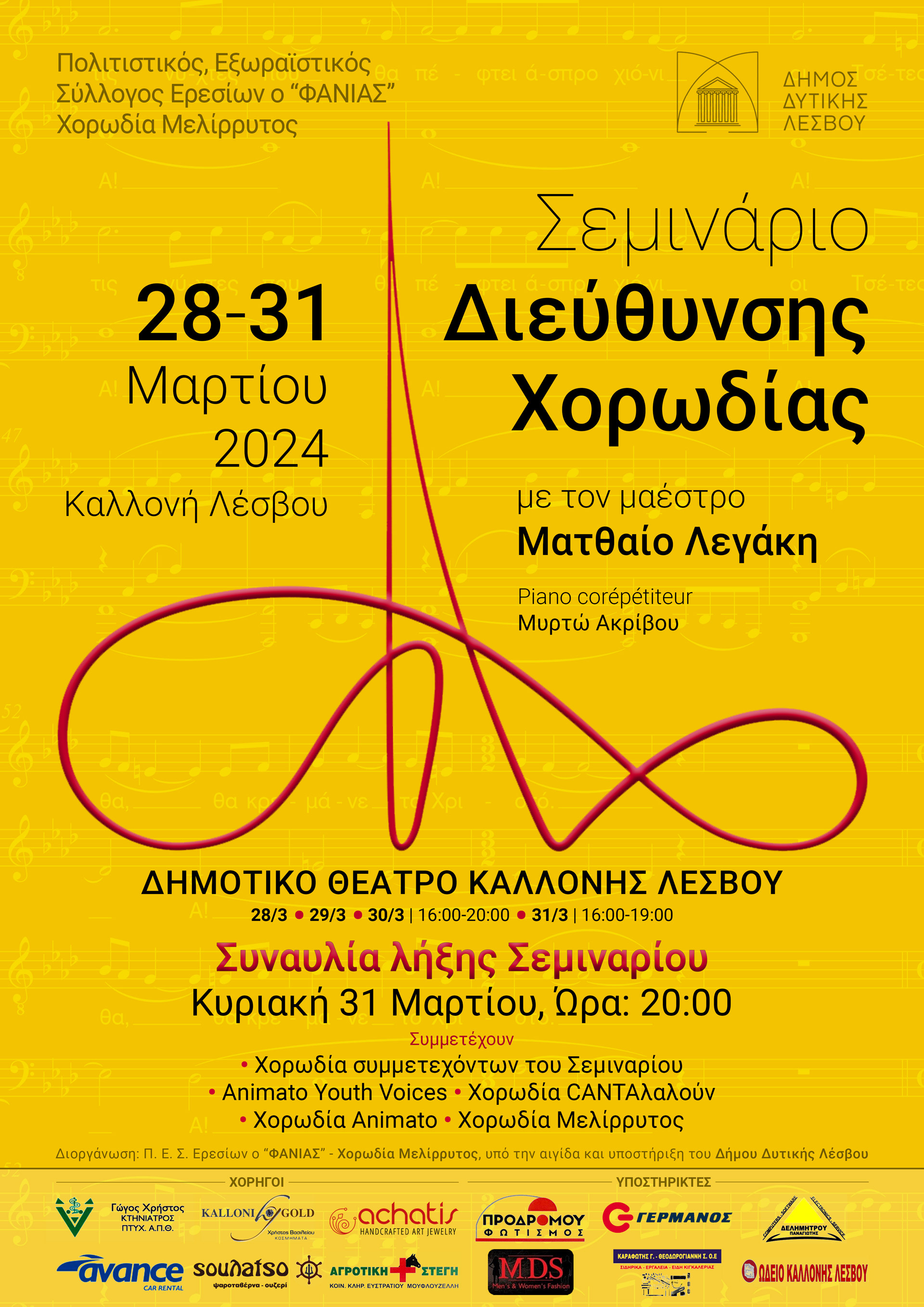 Ο Πολιτιστικός, Εξωραϊστικός Σύλλογος Ερεσίων ο «ΦΑΝΙΑΣ» και η Χορωδία Μελίρρυτος, υπό την αιγίδα και υποστήριξη του Δήμου Δυτικής Λέσβου, διοργανώνει Σεμινάριο Διεύθυνσης Χορωδίας (διάρκειας 15 ωρών), με τον μαέστρο Ματθαίο Λεγάκη.