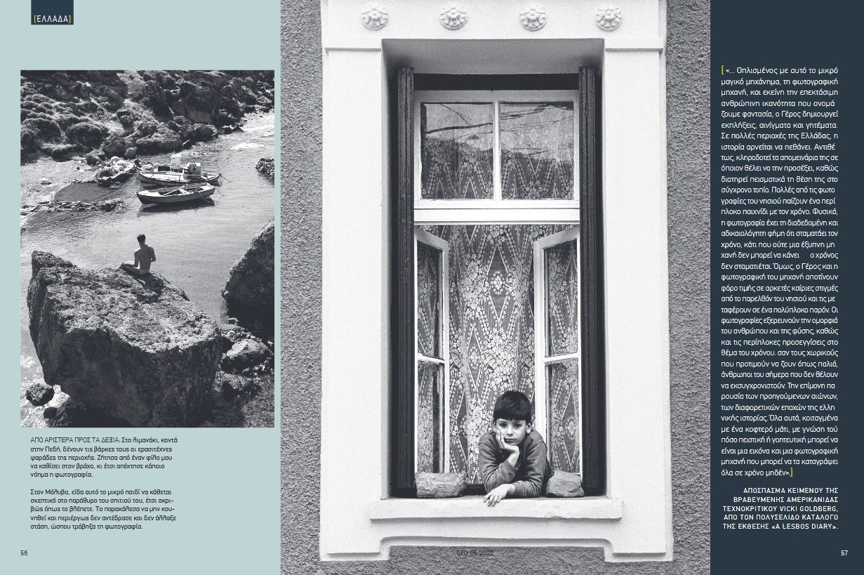 ...Οπλισμένος με αυτό το μικρό μαγικό μηχάνημα, τη φωτογραφική μηχανή, και εκείνη την επεκτάσιμη ανθρώπινη ικανότητα που ονομάζουμε φαντασία, o Γέρος δημιουργεί εκπλήξεις, αινίγματα και γητέματα. Σε πολλές περιοχές της Ελλάδας, η ιστορία αρνείται να πεθάνει. Αντιθέτως, κληροδοτεί τα απομεινάρια της σε όποιον θέλει να την προσέξει καθώς διατηρεί πεισματικά τη θέση της στο σύγχρονο τοπίο. Πολλές από τις φωτογραφίες της Λέσβου παίζουν ένα περίπλοκο παιχνίδι με το χρόνο. Φυσικά, η φωτογραφία έχει τη διαδεδομένη και αδικαιολόγητη φήμη ότι σταματάει τον χρόνο, κάτι που ούτε μια έξυπνη μηχανή δεν μπορεί να κάνει — ο χρόνος δεν σταματιέται. Όμως ο Γέρος και η φωτογραφική του μηχανή αποτίουν φόρο τιμής σε αρκετές καίριες στιγμές από το παρελθόν του νησιού και τις μεταφέρουν σε ένα πολύπλοκο παρόν. Οι φωτογραφίες εξερευνούν την ομορφιά του ανθρώπου και της φύσης καθώς και τις περίπλοκες προσεγγίσεις στο θέμα του χρόνου: σαν τους χωρικούς που προτιμούν να ζουν όπως παλιά, άνθρωποι του σήμερα που δεν θέλουν να εκσυγχρονιστούν. Την επίμονη παρουσία των προηγούμενων αιώνων, των διαφορετικών εποχών της ελληνικής ιστορίας. Όλα αυτά, κοιταγμένα μ’ ένα κοφτερό μάτι, με γνώση τού πόσο πειστική ή γοητευτική μπορεί να είναι μια εικόνα, και μια φωτογραφική μηχανή που μπορεί να τα καταγράψει όλα σε χρόνο μηδέν.