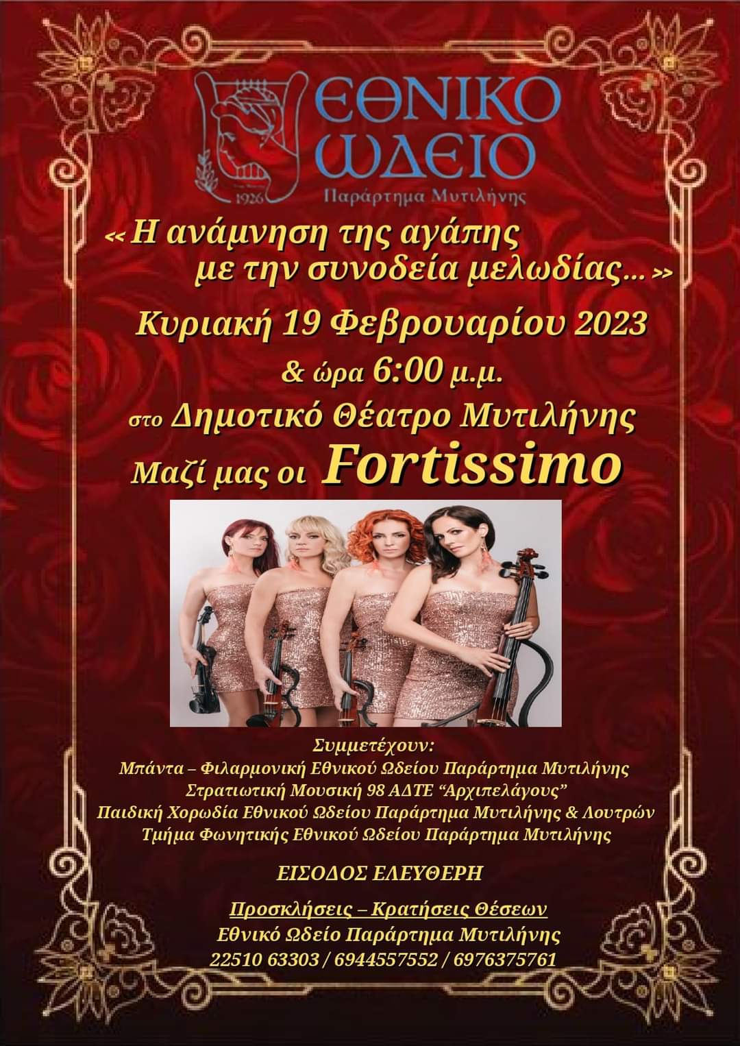 Το Παράρτημα Μυτιλήνης του Εθνικού Ωδείου διοργανώνει, την Κυριακή 19 Φεβρουαρίου 2023 & ώρα 6:00 μ.μ. στο Δημοτικό Θέατρο Μυτιλήνης, Συναυλία Αγάπης με τίτλο «Η ανάμνηση της αγάπης με την συνοδεία μελωδίας..».