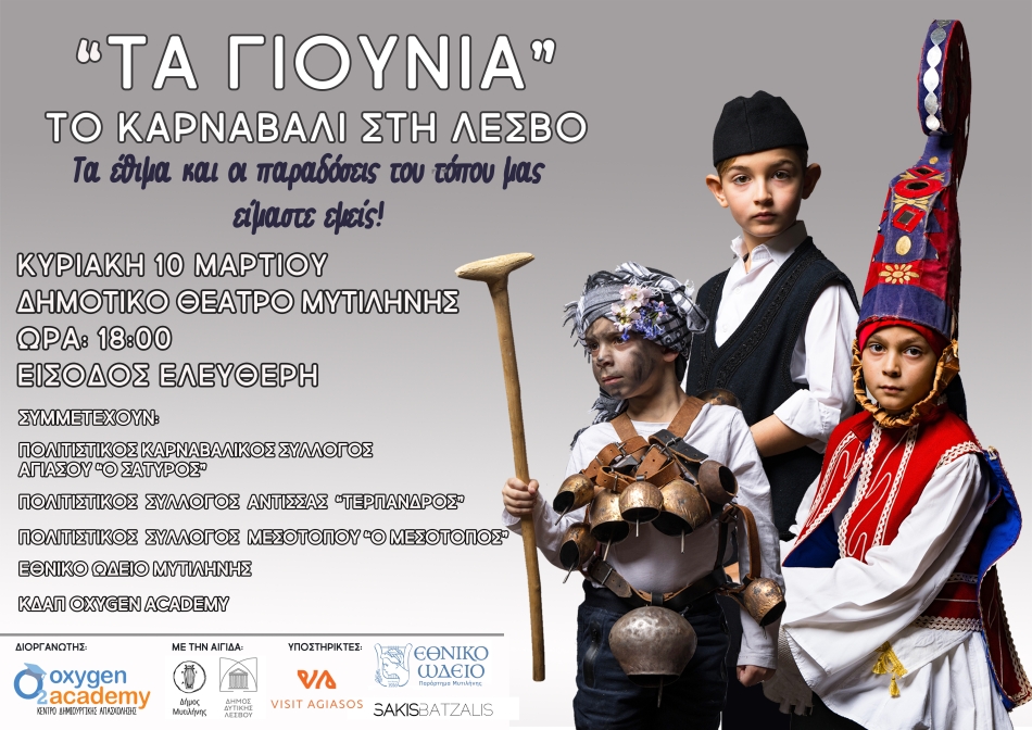 Το ΚΔΑΠ Oxygen Academy διοργανώνει την Κυριακή 10 Μαρτίου στο Δημοτικό Θέατρο Μυτιλήνης στις 18:00 σε μια εκδήλωση με τίτλο «ΤΑ ΓΙΟΥΝΙΑ», όπου συμμετέχουν ο Πολιτιστικός Καρναβαλικός Σύλλογος Αγιάσου «Ο Σάτυρος», ο Πολιτιστικός Σύλλογος Άντισσας «Τέρπανδρος», ο Πολιτιστικός Σύλλογος Μεσοτόπου «Ο Μεσότοπος» και το παράρτημα Μυτιλήνης του Εθνικού Ωδείου.
