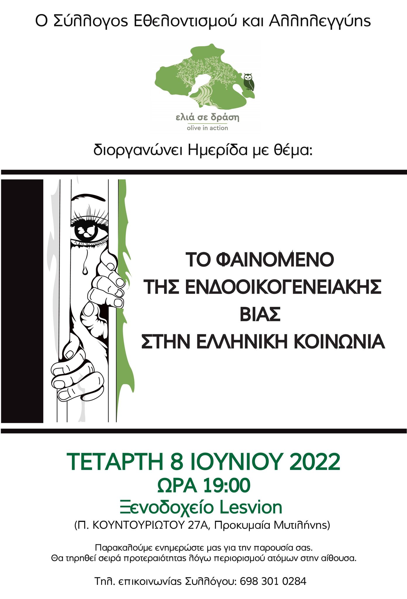 Ο Σύλλογος Εθελοντισμού και Αλληλεγγύης «Ελιά σε δράση» διοργανώνει ημερίδα με θέμα: «Το φαινόμενο της ενδοοικογενειακής βίας στην ελληνική κοινωνία», η οποία θα πραγματοποιηθεί την Τετάρτη 8 Ιουνίου 2022, στο Ξενοδοχείο «Lesvion».