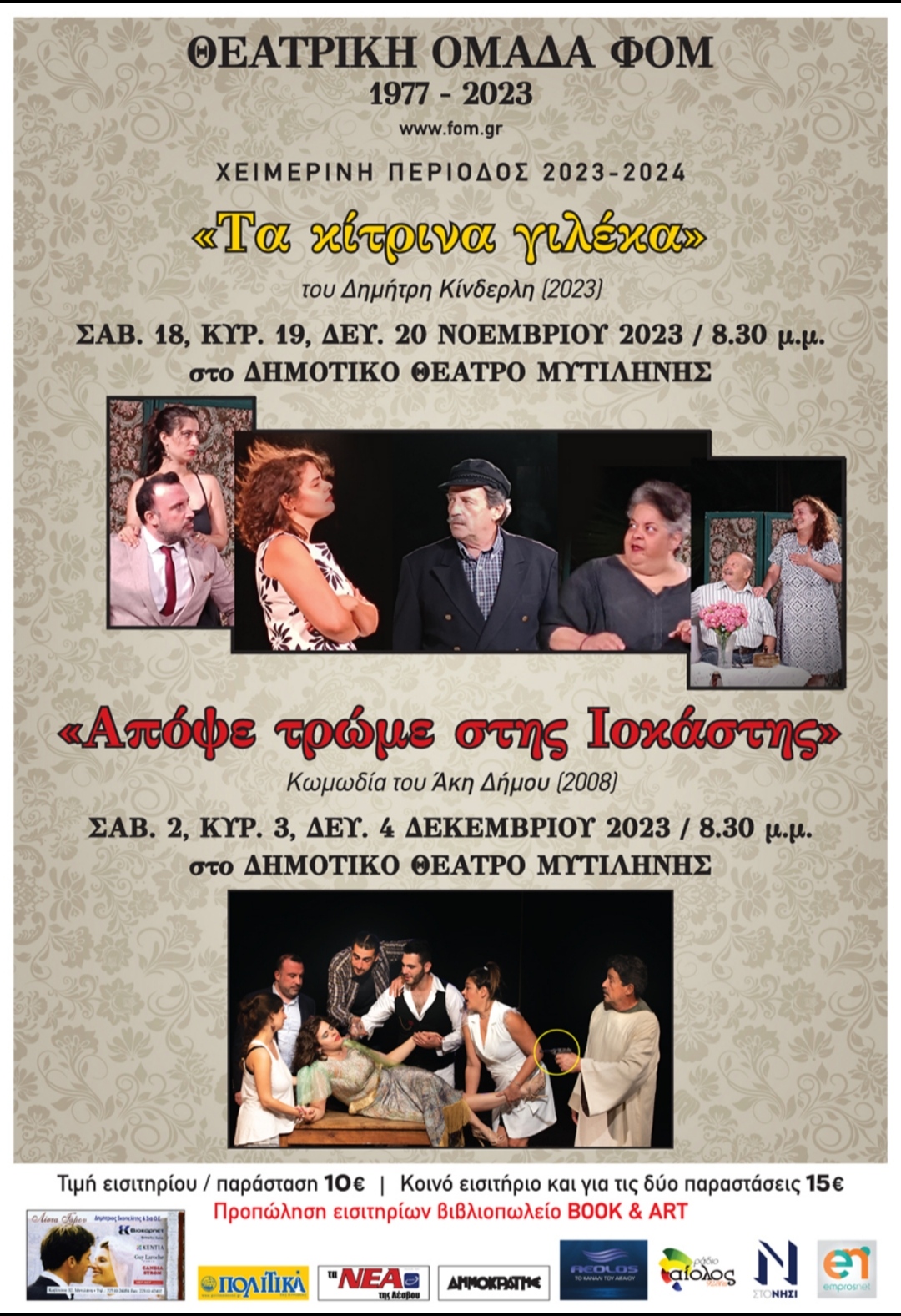 Αναλυτικότερα το Σάββατο 18, Κυριακή 19 και Δευτέρα 20 Νοεμβρίου το έργο του Δημήτρη Κίνδερλη ΤΑ ΚΙΤΡΙΝΑ ΓΙΛΕΚΑ και το Σάββατο 2, Κυριακή 3 και Δευτέρα 4 Δεκεμβρίου την κωμωδία του Άκη Δήμου ΑΠΟΨΕ ΤΡΩΜΕ ΣΤΙΣ ΙΟΚΑΣΤΗΣ. Και οι δύο παραστάσεις θα πραγματοποιηθούν στο Δημοτικό Θέατρο Μυτιλήνης,στις 8:30μμ., η προπώληση των εισιτηρίων θα γίνεται στο βιβλιοπωλείο BOOK&ART [Εισιτήριο 10 €- Φοιτητικό 5€, κοινό και για τις δύο παραστάσεις 15€].
