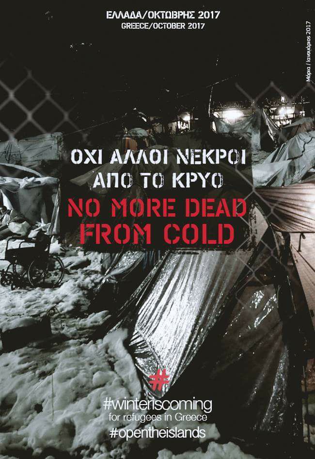 Σαράντα-τρεις ομάδες και οργανώσεις αλληλλεγγύης που δρουν στα ελληνικά νησιά και την ηπειρωτική χώρα καλούν τις ντόπιες και κεντρικές αρχές να λάβουν επειγόντως μέτρα ώστε να αποφευχθούν περισσότεροι θάνατοι προσφύγων από το κρύο, καθώς ο χειμώνας πλησιάζει. Με το μήνυμα #opentheislands (ανοίξτε τα νησιά) ζητούν να αποσυμφορηθούν τα νησιά, να κλείσουν τα χοτ- σποτ, να απεγκλωβιστούν οι πρόσφυγες και να ακυρωθεί η κοινή δήλωση ΕΕ- Τουρκίας.
