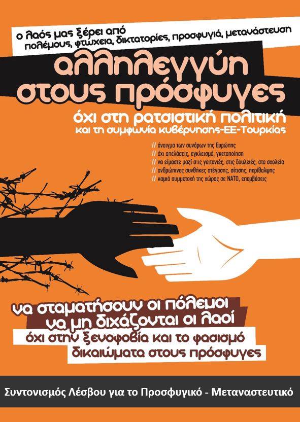 Ο αγώνας των προσφύγων της πλατείας Σαπφούς που βρίσκεται σε εξέλιξη πάνω από ένα μήνα είναι αποτέλεσμα των απάνθρωπων συνθηκών διαβίωσης που η κυβέρνηση ΣΥΡΙΖΑ – ΑΝΕΛ επιβάλει στους πάνω από 8000 πρόσφυγες και μετανάστες που βρίσκονται στη Λέσβο. Η ζωή τους είναι μια πραγματική κόλαση κι έχουν κάθε δικαίωμα να διεκδικούν το άνοιγμα των συνόρων για να συνεχίζουν το ταξίδι τους προς τον τελικό τους προορισμό. Δηλώνουν ότι είναι πρόσφυγες και όχι εγκληματίες και αγωνίζονται για το αυτονόητο δικαίωμα τους να φύγουν από το νησί. Ο αγώνας τους για ζωή και ελευθερία έρχεται σε πλήρη αντίθεση με τις αντιμεταναστευτικές πολιτικές της Ευρωπαϊκής Ένωσης και της Ελληνικής κυβέρνησης, όπως και με την συμφωνία Ε.Ε. - Τουρκίας που συνέπεια αυτής είναι ο εγκλωβισμός χιλιάδων προσφύγων στα νησιά του Ανατολικού Αιγαίου.