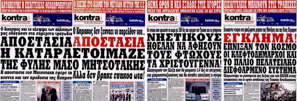 Στα χρόνια του (βαθέως) ΠΑΣΟΚ, κάπου στη δεκαετία του ’80, εάν ήθελες να δεις τη στρατηγική του Ανδρέα Παπανδρέου δεν διάβαζες ούτε ΒΗΜΑ ούτε ΝΕΑ. Διάβαζες την ΑΥΡΙΑΝΗ του Κουρή. Τα ίδια και σήμερα. Αρκεί να παρατηρείς τα πρωτοσέλιδα της Kontra News, επίσης του Κουρή, για να καταλαβαίνεις πού πάει το πράμα. Ο… καλός Αλέξης που μοιράζει χρήμα στους φτωχούς, ο «κακός» Κυριάκος που μηχανεύεται αποστασίες. Το μόνο που μένει να βάλουν είναι μια φώτο του Κυριάκου εν μέσω δυο Ναζιστών! Είναι δυνατόν; Τότε ούτε καν είχε γεννηθεί! Λεπτομέρειες.