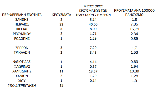 Όσον αφορά στην κατανομή των κρουσμάτων, στην Αττική καταγράφονται τα 221 -σχεδόν τα μισά για μια ακόμα ημέρα- ενώ στο κέντρο της Αθήνας βρέθηκαν 66 νέα κρούσματα. Μείωση παρουσιάζεται στην Δυτική Αττική με 6 νέες μολύνσεις. Στην Θεσσαλονίκη καταγράφηκαν 58 νέα κρούσματα, 20 στην Πιερία και 19 στην Εύβοια.