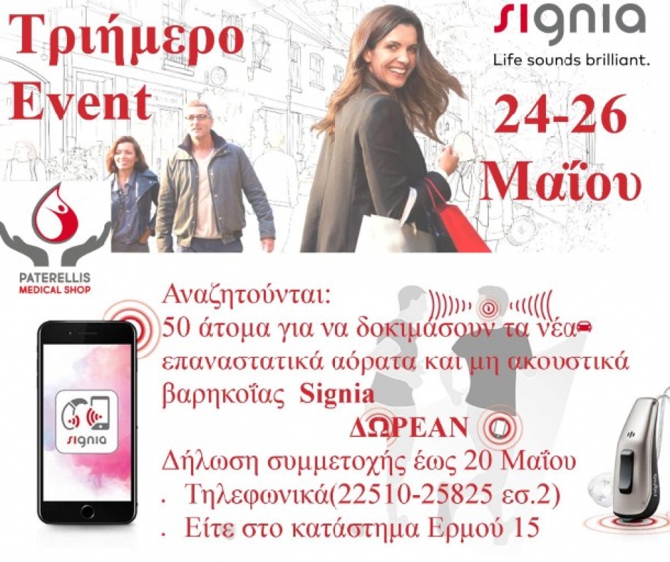 Η εταιρεία ΠΑΝΤΕΛΗΣ ΠΑΤΕΡΕΛΛΗΣ ΚΑΙ ΣΙΑ Ε.Ε. καινοτόμος στο χώρο των ακουστικών βαρηκοϊας SIGNIA εδώ και 15 χρόνια, διοργανώνει τo 2o ετήσιο τριήμερο event δωρεάν ενημέρωσης – δοκιμής και εφαρμογής ακουστικών SIGNIA, στις 24 με 26 Μαΐου.
